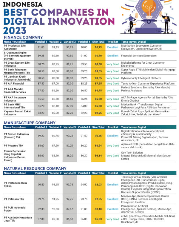 Adapun para pemenang Digital Innovation Award 2023 adalah PT Prudential Life Assurance, S-Quantum Engine Powered by Sinarmas Financial Services, PT Bank Tabungan Negara (Persero) Tbk, PT Jamkrindo, TelkomMetra, Blibli, PERURI, Telkom Indonesia, Great Eastern Life dan Jasa Marga.